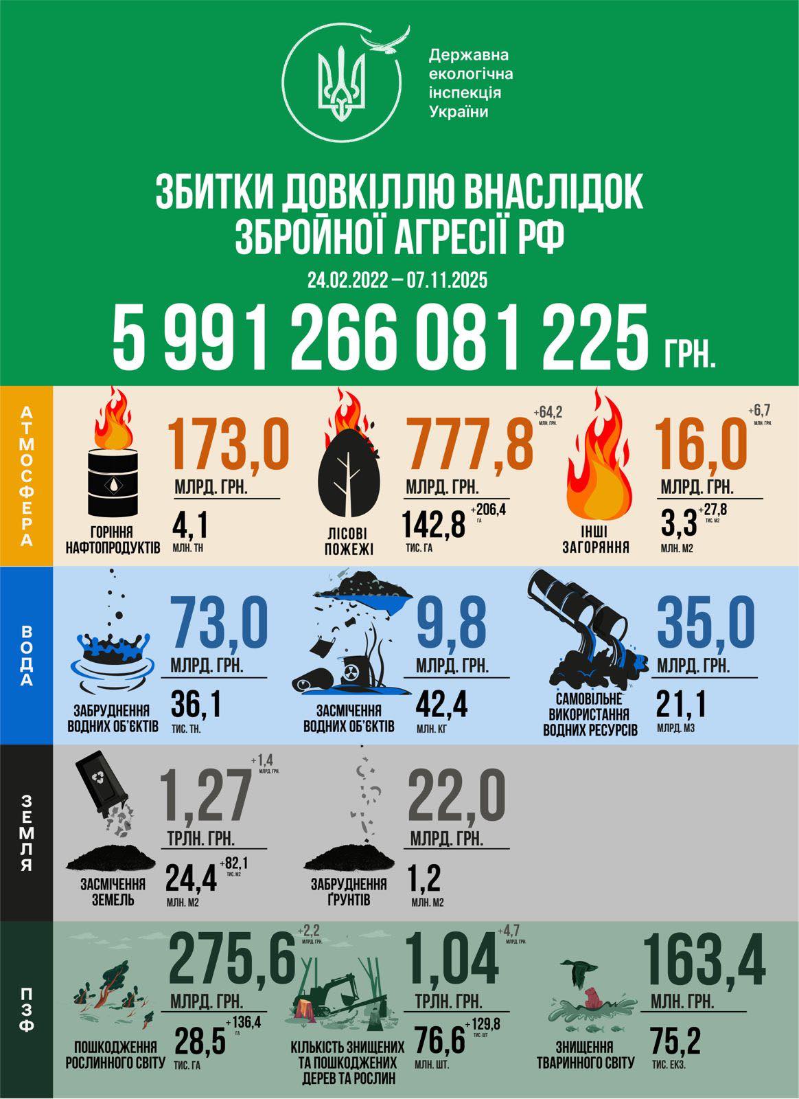 Станом на 7 листопада 2025 року оновлена щотижнева інфографіка про збитки, завдані довкіллю внаслідок збройної агресії рф