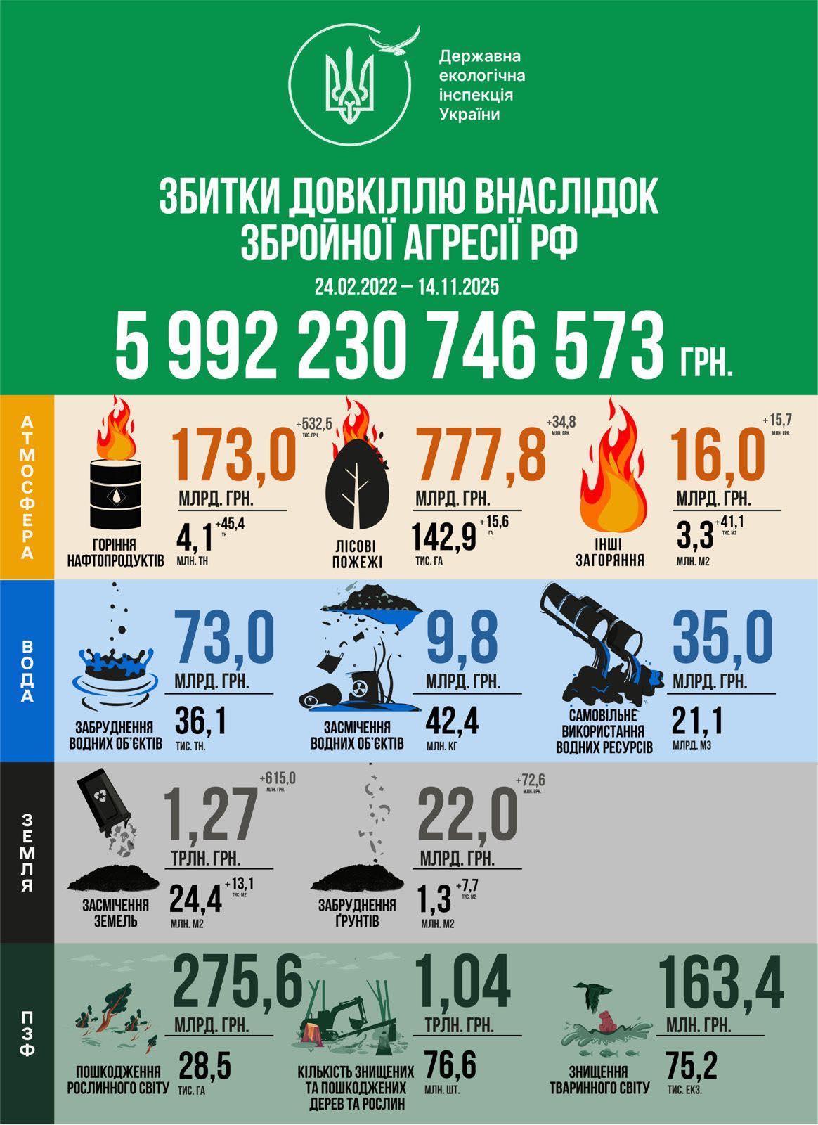 Станом на 14 листопада 2025 року оновлена щотижнева інфографіка про збитки, завдані довкіллю внаслідок збройної агресії рф