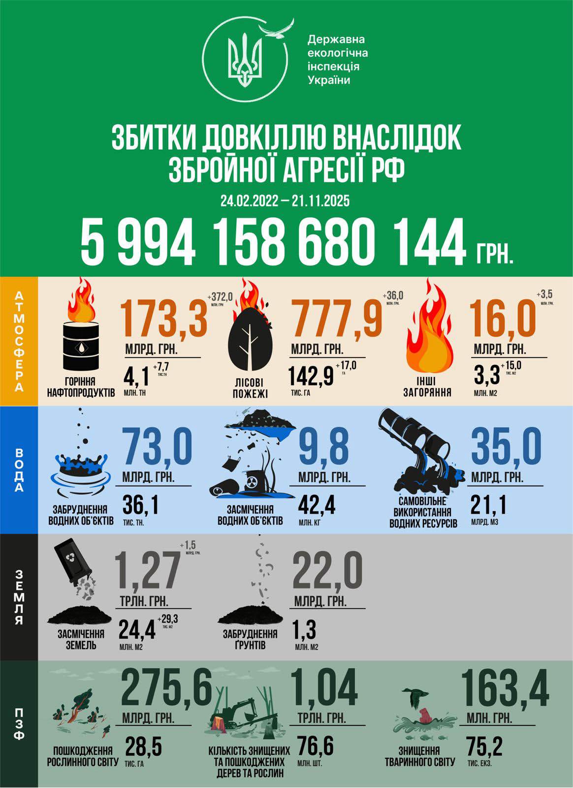 Станом на 21 листопада 2025 року оновлена щотижнева інфографіка про збитки, завдані довкіллю внаслідок збройної агресії рф