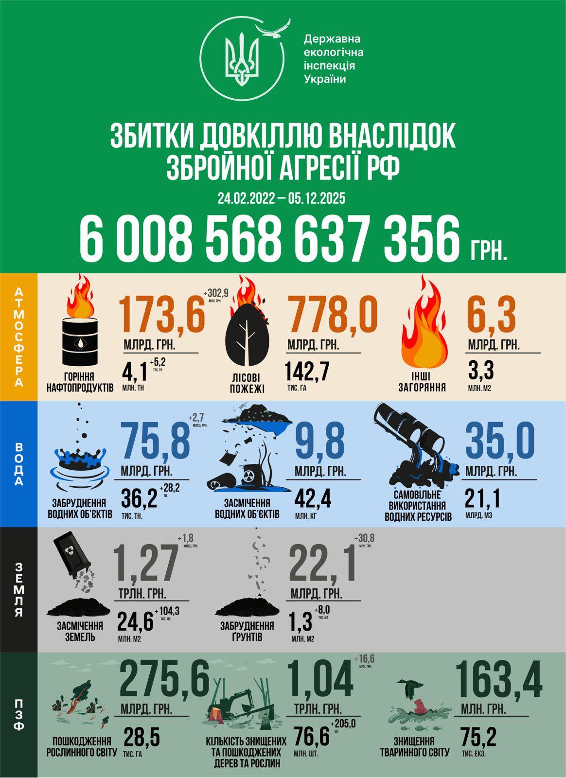 Станом на 5 грудня 2025 року оновлена щотижнева інфографіка про збитки, завдані довкіллю внаслідок збройної агресії рф